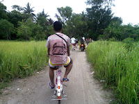 Kami menyebrangi menggunakan kapal nelayan, kayu tampak berjamur dan rapuh. Hingga suatu ketika ada 2 orang yang menyender pinggiran kapal terjatuh ke laut karena pinggiran kapal patah. Namun 2 orang itu terselamatkan.